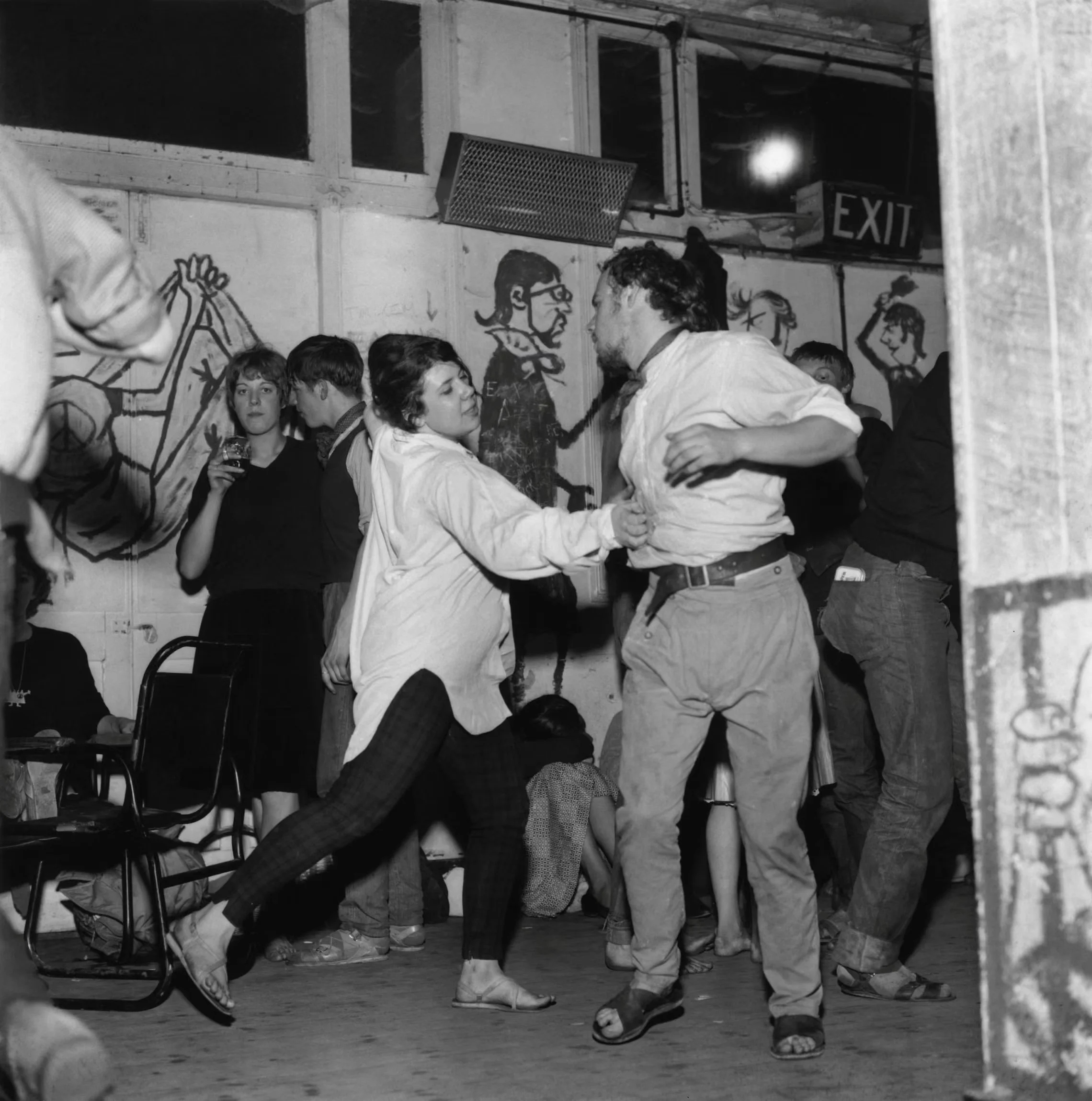 There’s a large converted barn, you go down some steps after conning your way in with 6d – it’s usually 3/6d – your wrist is stamped and you go down. It’s very dark with just red and green lights. Long John Baldry is singing with his band at one end of the hall. The walls are white flaking and full of cobwebs, with cartoons, murals and names printed over them. People dance there crazily. Next door is the pub, where we and the musicians all congregate, we con drinks and play the jukebox and talk to everyone. I often go there on my own but always end up meeting someone I know to dance with.