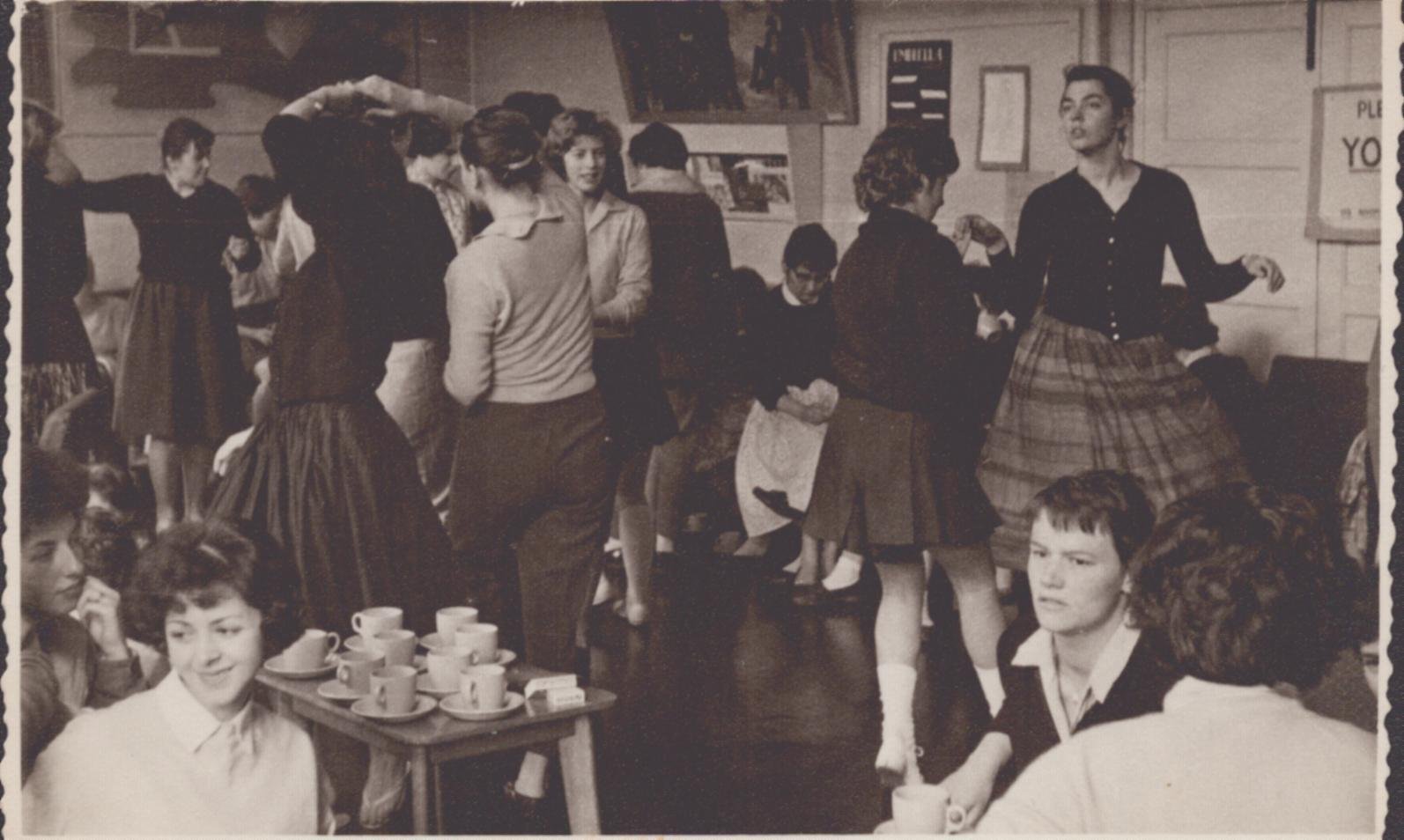 Common room tea dance, Maria Grey teacher training college, circa 1954. My mum is the centre of the photo facing toward the camera